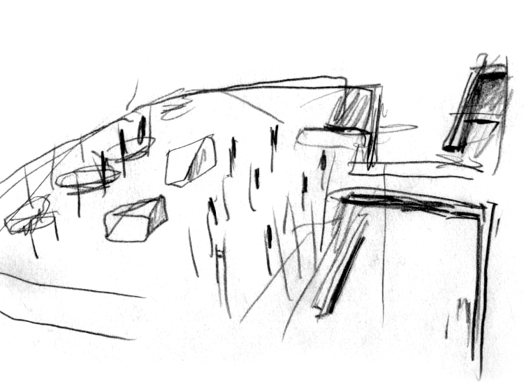 La calle entre los dos edificios: A cielo abierto y caracterizada por sus contundentes límites arquitectónicos. Significa un recorrido de transición entre la calle y los edificios, su carácter es despojado en el que se distinguen unos tragaluces en el sector norte y el hueco lineal con álamos en el sector sur. El sistema de rampas de conexión entre ambos edificios acomoda la escala de dicho espacio.