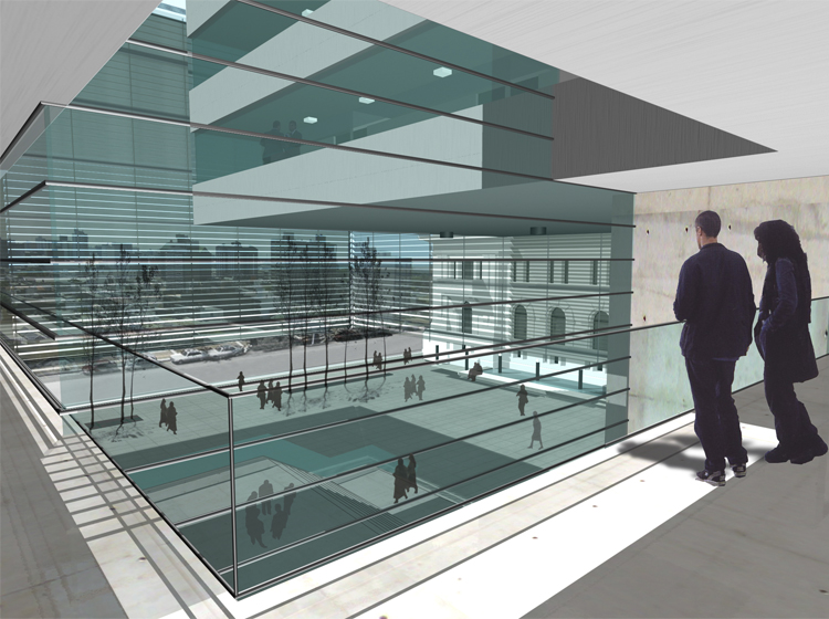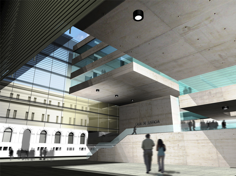 No sólo la configuración de la envolvente arquitectónica ofrece un aporte al entorno urbano, sino también el establecimiento de un sistema de recintos públicos que actúen como soporte espacial de los servicios institucionales que caracterizan el sector.