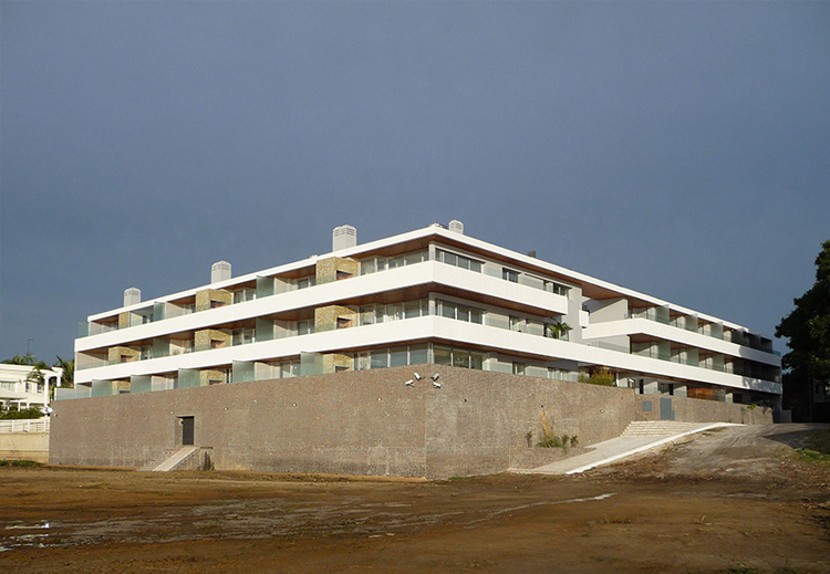 Ciudad de Santa Fe, Argentina. En el borde de Guadalupe, un barrio residencial de baja densidad y frente a unas vistas espectaculares de la laguna Setúbal, una planta en” L” organiza las viviendas en dos bloques separados por el ingreso. Las 6 circulaciones verticales combinan los departamentos de a dos de modo de poder unirlas a demanda. Cada uno tiene doble frente: las zonas de estar, cocina y comedor que se prolongan en terrazas hacia el exterior y los dormitorios hacia un patio ene l interior de la manzana que contiene los usos comunes (piscina, solárium, quincho, sauna y gimnasio) sobre una terraza jardín que techa las cocheras.